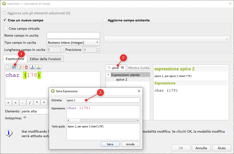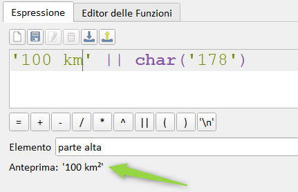per non dimenticare la funzione e il relativo codice dell’apice 2, è possibile memorizzare, nel profilo corrente di QGIS, l’espressione char (178) e richiamarla in qualsiasi momento: