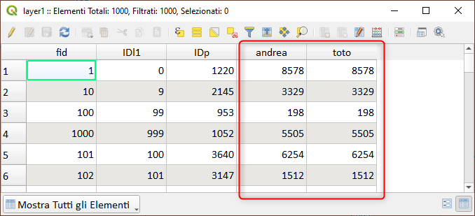 entrambe le soluzioni risolvono il problema, ma la complessità viene pagata tramite un tempo di elaborazione lungo su grossi dataset (per il dataset allegato e nel mio PC [Dell G5]: circa 7 e 3 sec, rispettivamente la prima e seconda soluzione); sotto un esempio della tabella degli attributi del layer1: