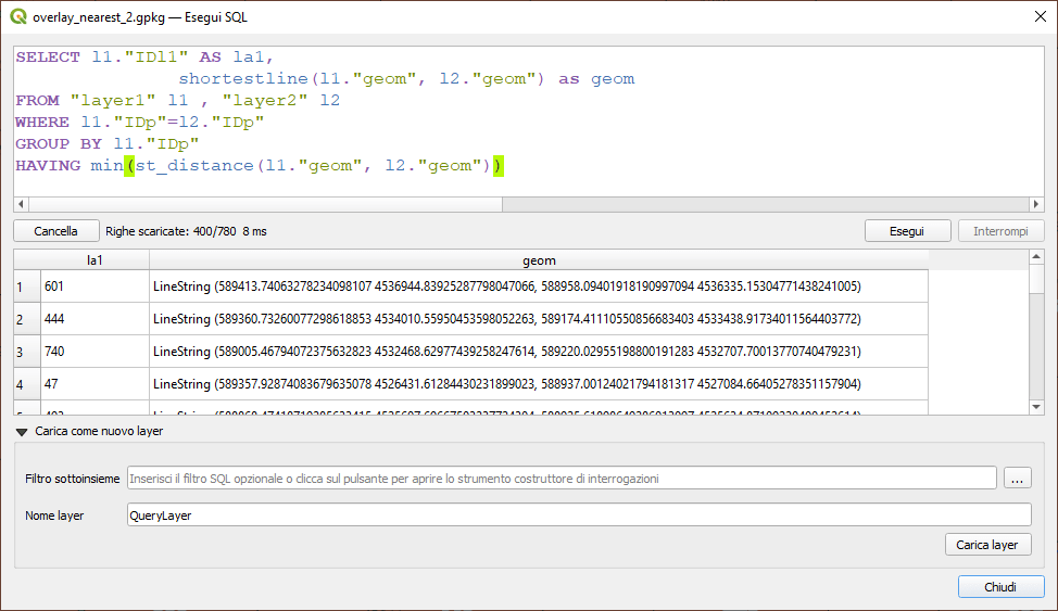 NOTE FINALI: Le query spaziali SQL risolvono brillantemente questi quesiti, sia in termini di facilità di scrittura della query che di tempo. Per fortuna QGIS ha la possibilità di creare layer a partire da query SQL usando vari dialetti: SQLite/SpatiaLite, PostgrSQL/PostGIS e altri.
