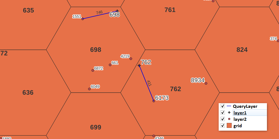 Sintetizzando: occorre acchiappare il punto (del layer2) più vicino (al layer1) ricadenti nello stesso poligono (grid) o che abbia lo stesso valore di un attributo.
