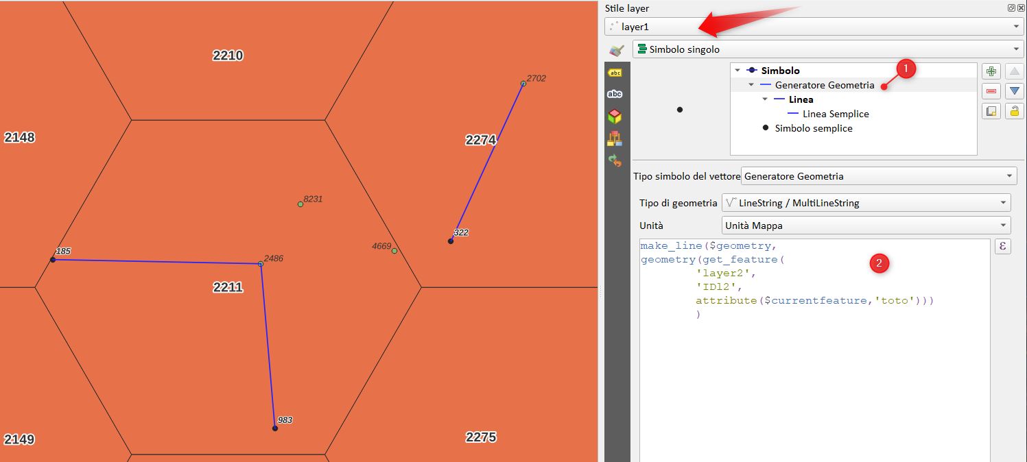 Per far tracciare il segmento che unisce i punti dei due layer possiamo creare un nuovo layer (come Generatore Geometria) nel tema del layer1: