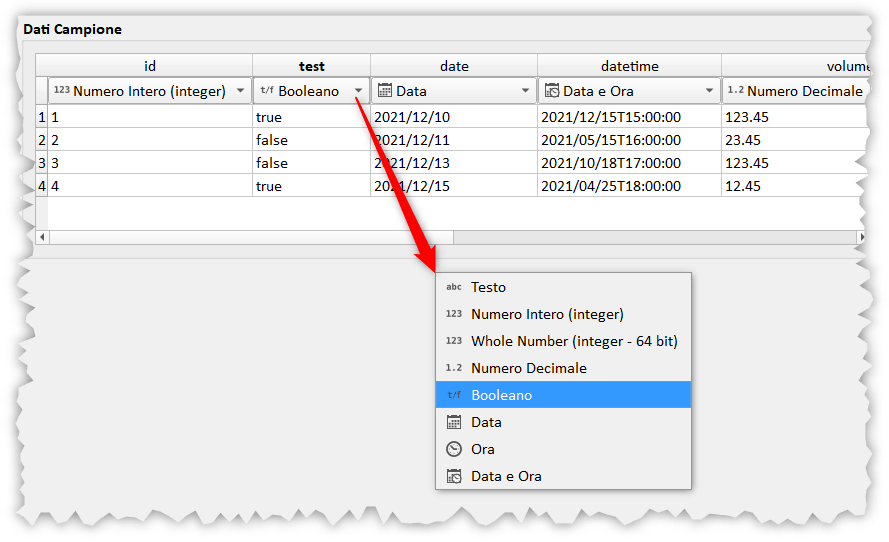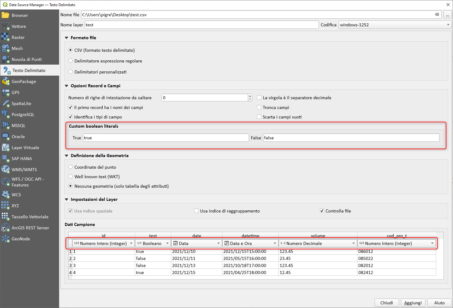 Nella prossima versione di QGIS 3.24 (febbraio 2022) saranno disponibili due nuove caratteristiche interessanti nel provider dei dati testo delimitato: il primo riguarda il supporto e riconoscimento automatico dei campi booleani; il secondo è la sostituzione del tipo di colonna.