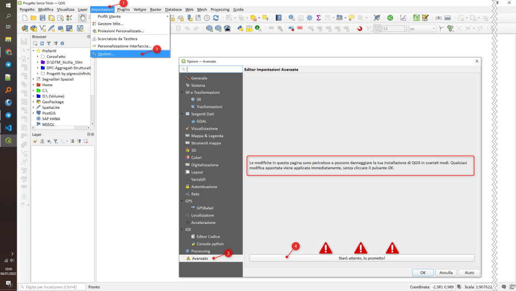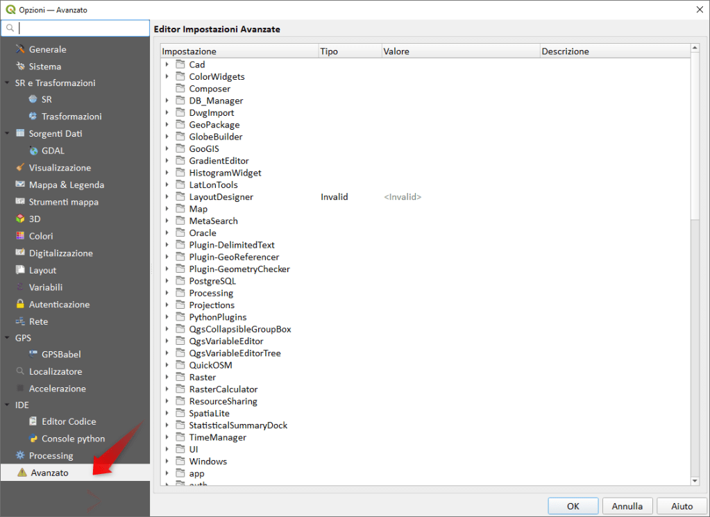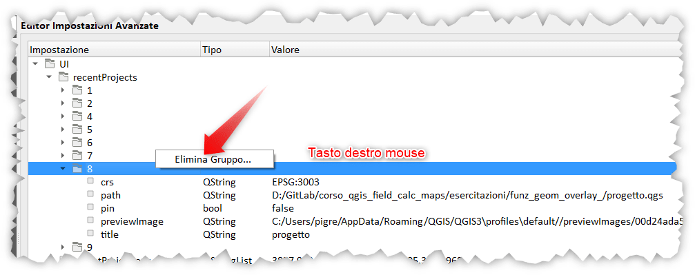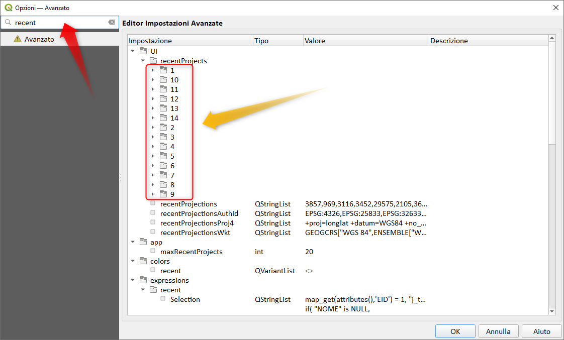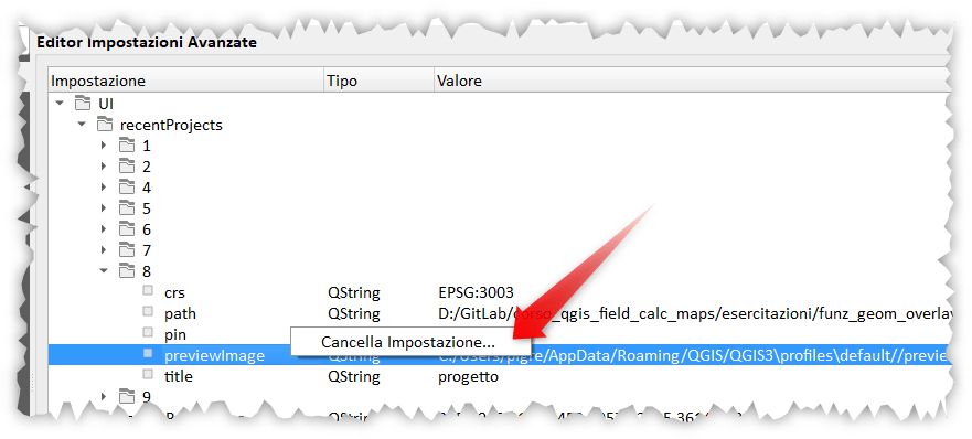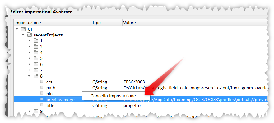 #QGIS Suggerimento per professionisti: alcune impostazioni non sono visibili dall’interfaccia utente, ma è possibile controllarle tramite il menu delle impostazioni “Avanzate”. Se vuoi rimuovere progetti, espressioni o algoritmi di elaborazione usati di recente dal menu, usa questo metodo.