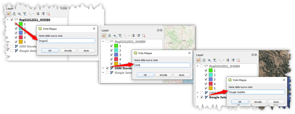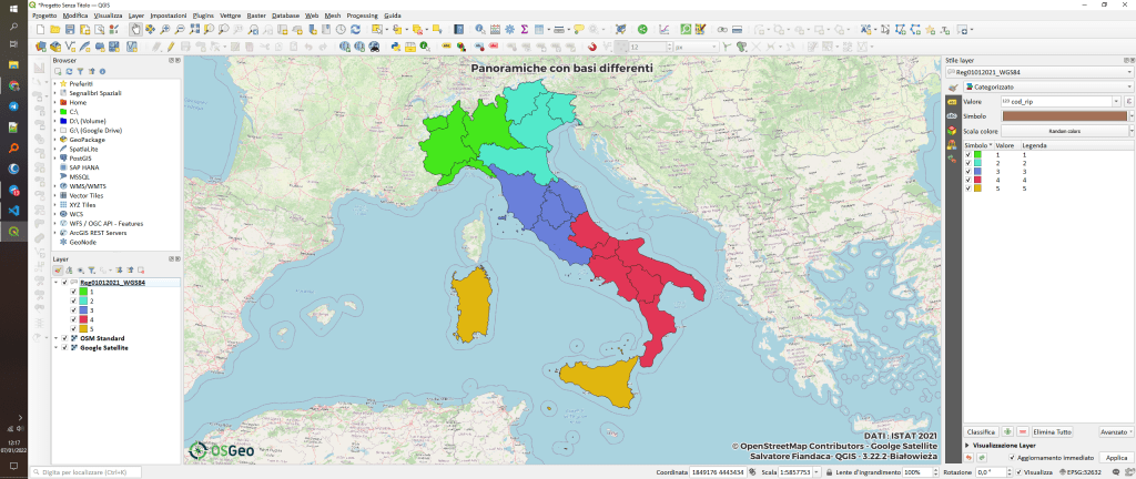 Carica in QGIS tre layer: Regioni ISTAT 2021 e due basemap: OSM e Google Satellite