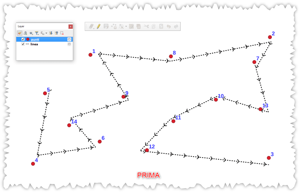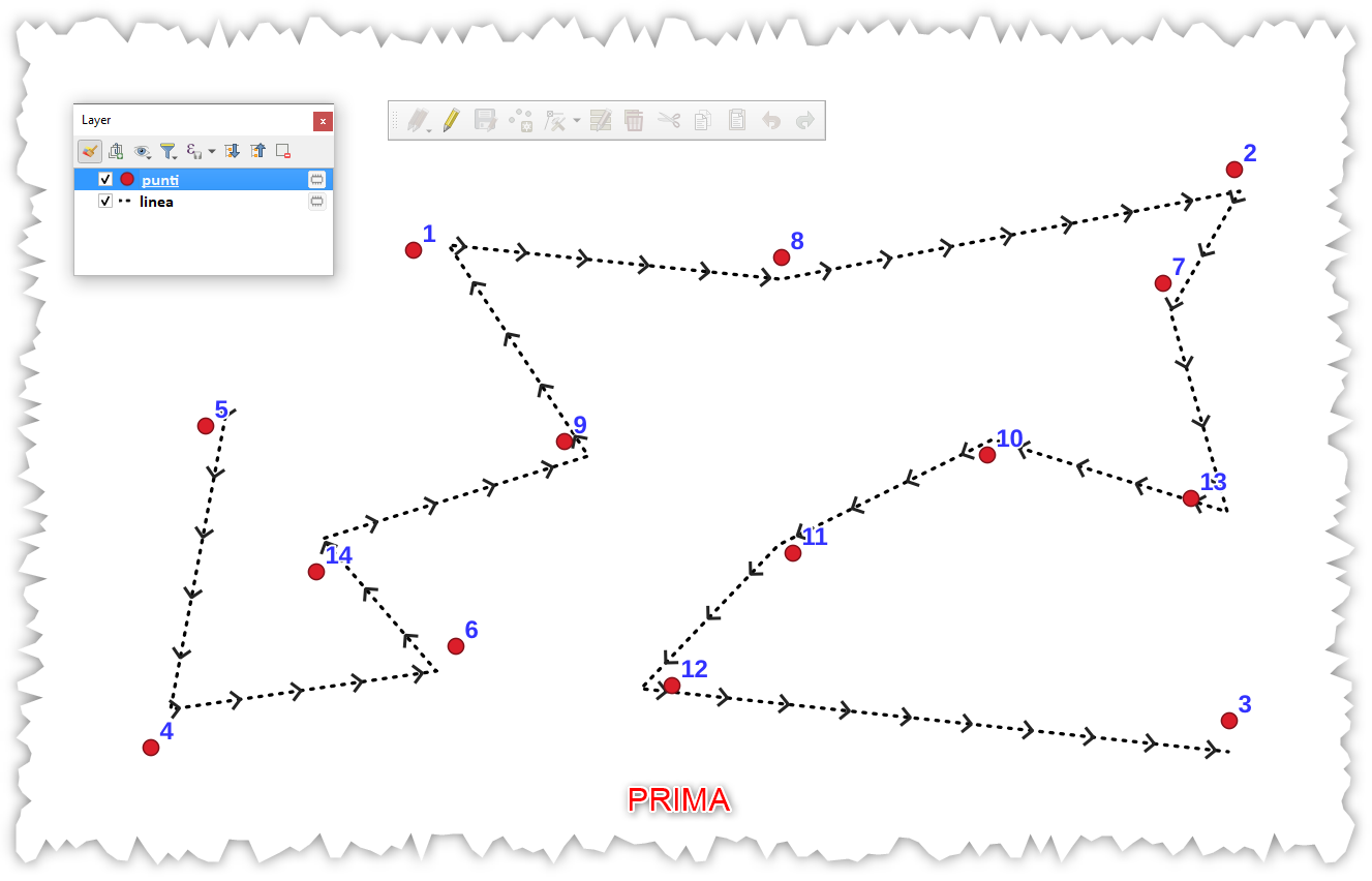 In questo blog post tratteremo il caso dell’ordinamento dei punti lungo una generica linea, ovvero, traccerò dei punti a caso e poi li ordinerò secondo una linea, anch’essa tracciata a caso, vedi gif animata: