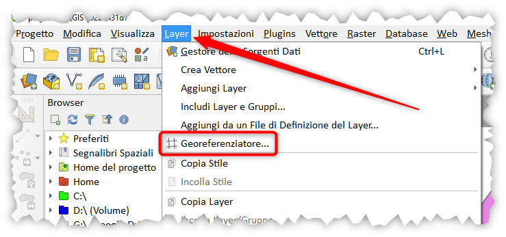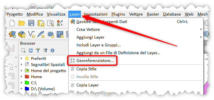 Il georeferenziatore è raggiungibile dal menu Layer:
