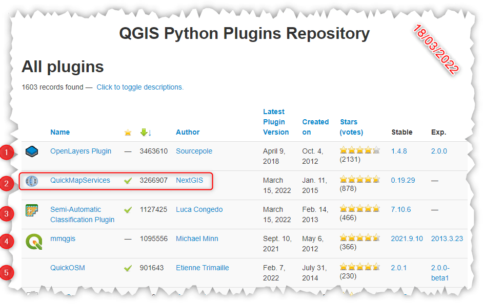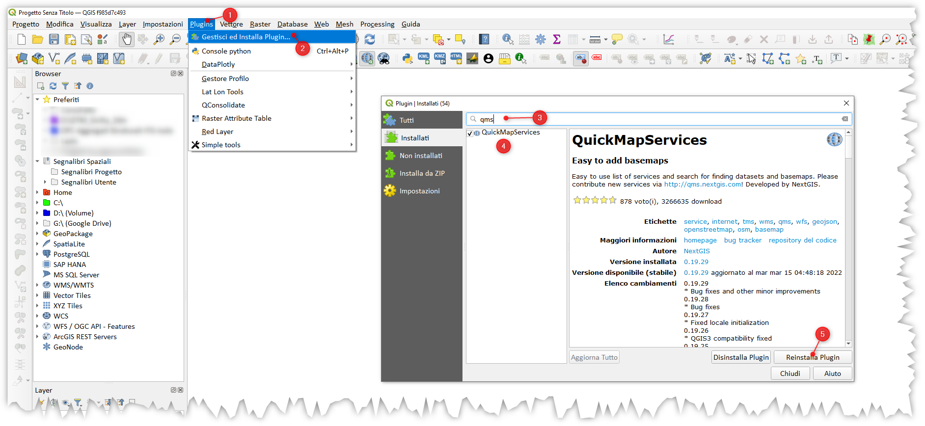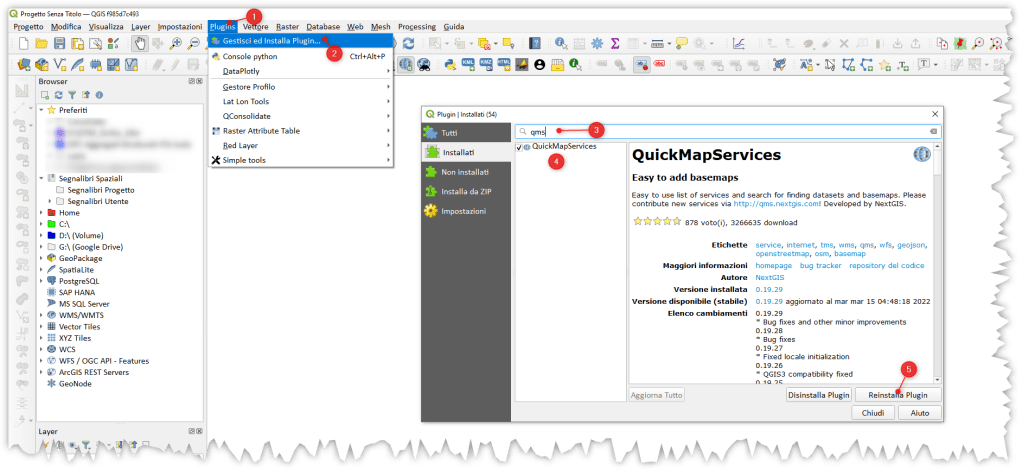 Il plugin QMS (QuickMapServices) è stato realizzato dall’azienda NextGIS nel 2015 e in pochi anni è diventato uno dei plugin più scaricati in assoluto, vedi screenshot sotto: