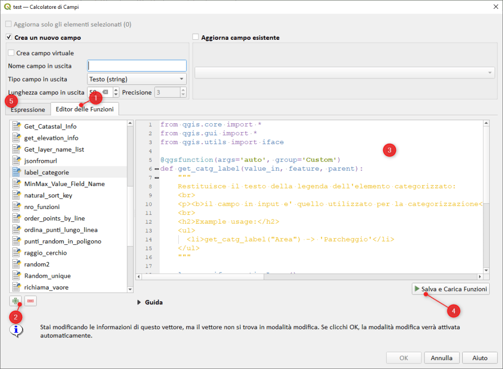 2. all’interno dell’interfaccia del field calc, cliccare nella sezione Editor delle Funzioni;