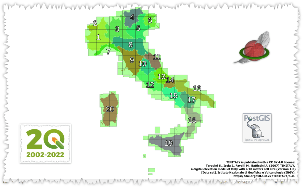 Dati due layer poligonali (per esempio le regioni italiane e il quadro di unione del DEM Tinitaly); assegnare, per ogni riquadro, il codice univoco (cod_reg) della regione che ha maggior estensione all’interno del riquadro stesso.